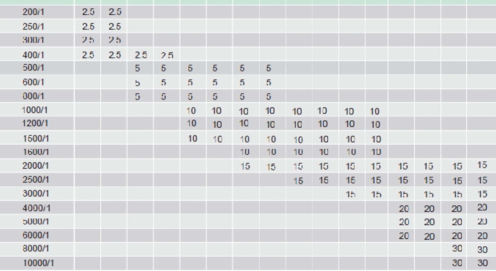 Product size table
