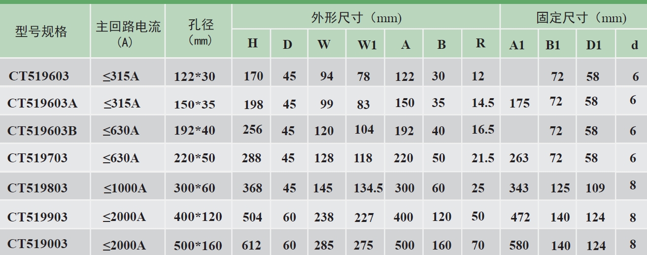 519系列剩余電流互感器主要用在380V、660V等低壓配電柜、對相應(yīng)回路的安裝節(jié)點(diǎn)處的剩余電流進(jìn)行持續(xù)的檢測、監(jiān)控之用。519系列包含5個(gè)適用于電纜回路的圓形窗口產(chǎn)品,和7個(gè)適用于銅排回路的矩形窗口產(chǎn)品,共計(jì)12個(gè)規(guī)格的產(chǎn)品,基本可以滿足3200A以下配電回路的所有剩余電流的檢測使用。